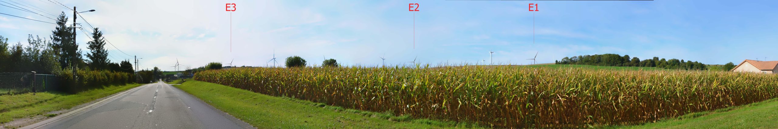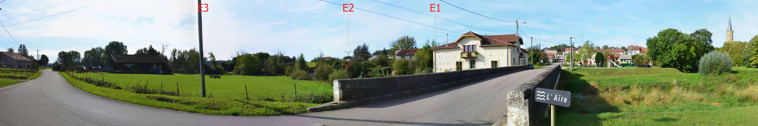 Point de vue n°3 : Depuis la frange bâtie sur de Beauzée-sur-Aire, le long de la RD998. L’éolienne la plus proche du point de vue se situe à 1 390 mètres (E1).
