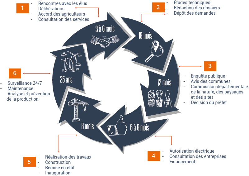 Le poste de livraison du parc éolien sera raccordé au poste source situé à moins de 7 kilomètres des éoliennes. Le transformateur situé dans l’éolienne convertit le courant produit par la machine de 720 volts à 20 000 volts puis l’électricité est acheminée vers le poste de livraison du parc grâce à des câbles enterrés. L’électricité est ensuite transportée du poste de livraison au poste source pour être injectée au final sur le réseau domestique en basse tension (230 volts).