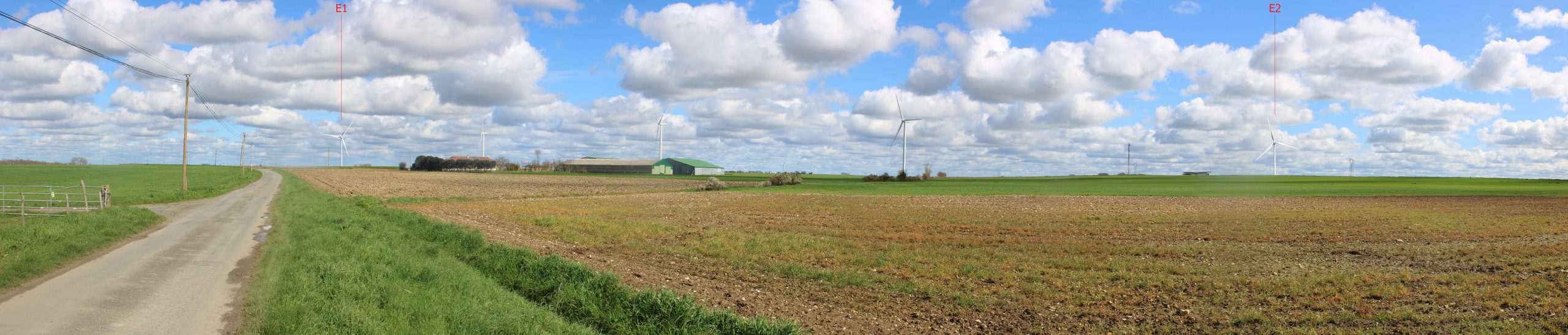 Point de vue n°3 : Depuis les abords du hameau La Tétarde. L’éolienne la plus proche du point de vue se situe à 1 300 mètres (E2).