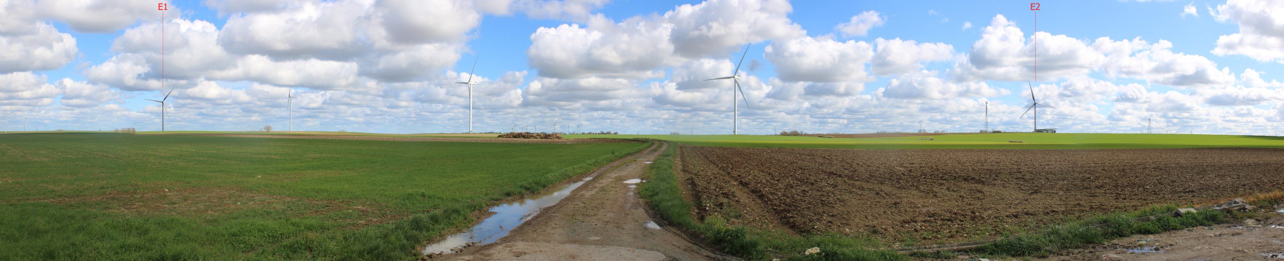 Point de vue n°1 : Depuis le centre de Longèves. L’éolienne la plus proche du point de vue se situe à 1 600 mètres (E2).